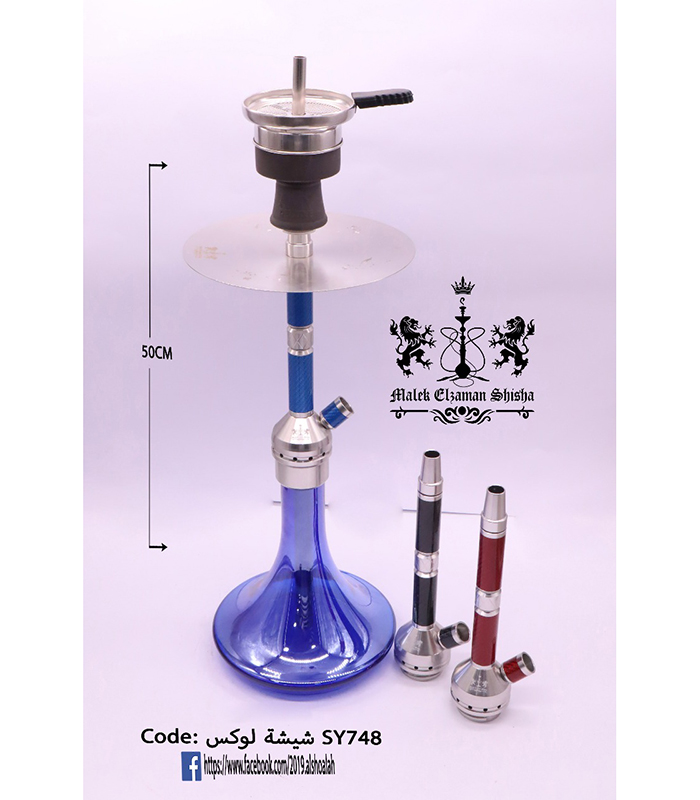 شيشة لوكس 50 سم بعمود معدني وقاعدة زرقاء، حجر إيمي، وطاسة واسعة لضبط الحرارة. تصميم فاخر يناسب الاستخدام اليومي والكافيهات.